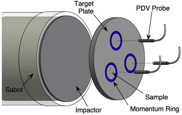 锻造316L SS冲击器在80mm气枪中加速并撞击目标以产生研究的两个峰值冲击应力。定位PDV探针用以观察每个样品的中心,以及层裂实验中提供自由表面测速数据。