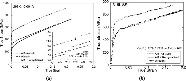 1.AM 316L SS显示出与退火锻造316L SS相比,屈服强度高出60%,明显的宏观凝固前沿结构,以及明显的化学偏析。其强度增加被认为是由于在AM工艺中固化期间形成的细小枝晶。并且结构残余应力与应变率跳跃试验结果不一致有助于AM 316L SS强化。