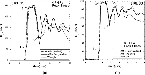 AM 316L SS的固有属性和冲击诱发层裂响应与退火锻造316L SS和再结晶AM 316L SS进行比较。有如下结论: