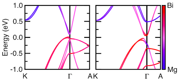 极性P63mc LiMgBi的带结构,其对应于正常绝缘体的-2.9%(左)和对应于拓扑绝缘体的±0.3%(右)。