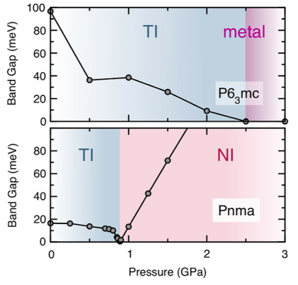 使用LDA计算得到的极性P63mc(上)和对极Pnma(底部)结构的KMgBi化合物的带状结构关于静水压力的函数。P63mc结构表现出拓扑绝缘体(TI)状态和金属状态,而Pnma结构显示拓扑绝缘体和正常绝缘体(NI)相。