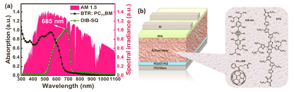 (a)参考太阳光辐射光谱,纯DIB-SQ膜和混合物BTR:PC 71 BM膜的吸收光谱