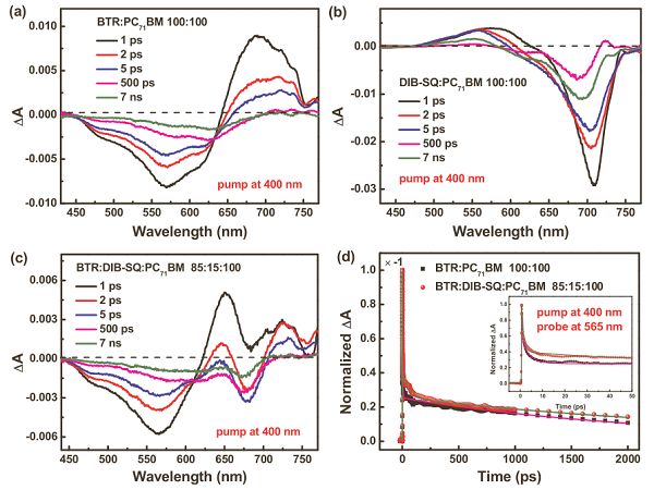 (d)二元BTR:PC71 BM共混膜和具有15wt% DIB-SQ的三元BTR:DIB-SQ:PC71 BM混合膜在供体中的瞬态吸收动力学分析