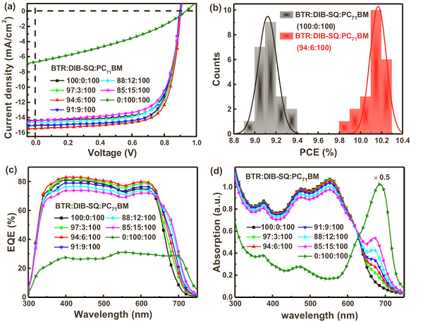 近日,北京交通大学张福俊教授和桂林电子HTH官网地址 大学张坚教授及国家纳米中心的刘新风研究员(共同通讯)等人在二元SMSCs基础上进行优化,选择小分子DIB-SQ作为制备三元SMSCs的第三组分。在给体中具有6wt%DIB-SQ的三元SMSCs获得了10.3%的功率转换效率。由于短电流密度(JSC)明显增加到15.44mA/cm2,填充因子(FF)增加到73.8%,PCE达到了10%左右。DIB-SQ的主要贡献可以概括为在长波长范围内增强光子收集和优化相分离。并报道了利用截止滤光片择光的方法,研究了三元体系中载流子输运的动力学过程,相关内容以题为“Ternary Small Molecule Solar Cells Exhibiting Power Conversion Efficiency of 10.3%”发表在了Nano Energy上。本文的第一作者为张苗博士和王健博士。