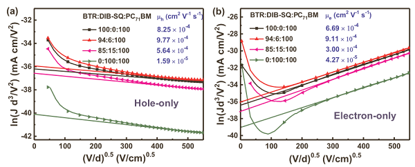 分别具有0wt%,6wt%,9wt%和100wt%DIB-SQ的(a)仅孔和(b)仅电子器件装置在暗处的(d3/V2) – (V/d)0.5特性