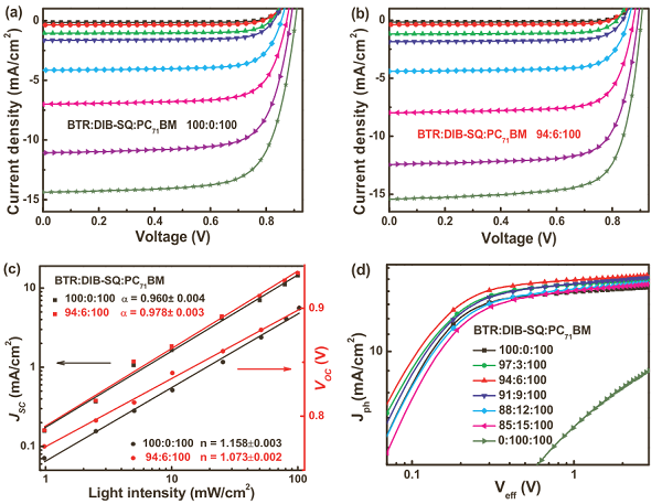 (c)JSC和VOC对SMSCs和优化的三元SMSCs光强度的依赖性