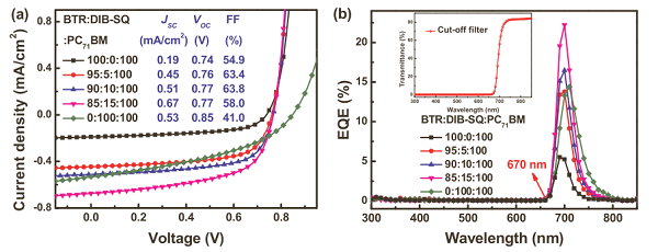 图9 二元和三元SMSC在670 nm截止滤光片覆盖下的J-V曲线及EQE光谱分析
