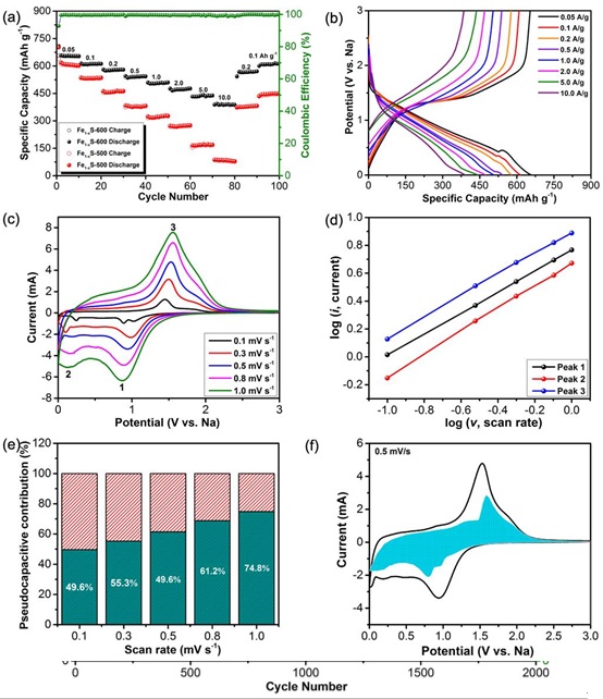 Fe1-xS纳米材料的(a)倍率性能曲线;(b)相应倍率下充放电曲线;(c)不同扫速下的CV曲线;(d)相应氧化还原峰下的log i vs. log v曲线;(e)不同扫速下的赝电容贡献;(f)扫速为0.5 mV s-1时,CV曲线及相应赝电容所占比例。