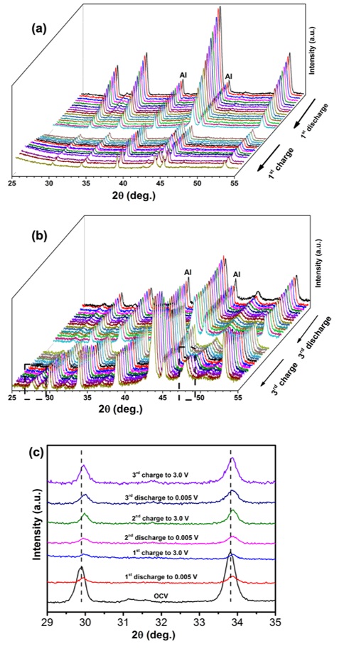 (a)第一周充放电原位XRD图;(b)第三周充放电原位XRD图;(c)一定充放电电位下XRD图。