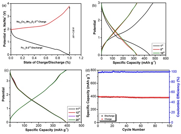 (a)Na0.6Co0.1Mn0.9O2正极和Fe1-xS负极充放电曲线对比;Na0.6Co0.1Mn0.9O2/Fe1-xS全电池在电流密度20 mA g-1时的电化学性能(b,c)充放电曲线;(d)循环稳定性曲线。