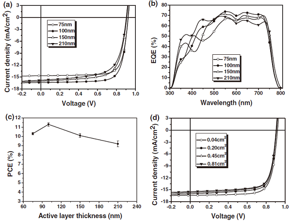 (c). 器件效率与活性层厚度的关系曲线;