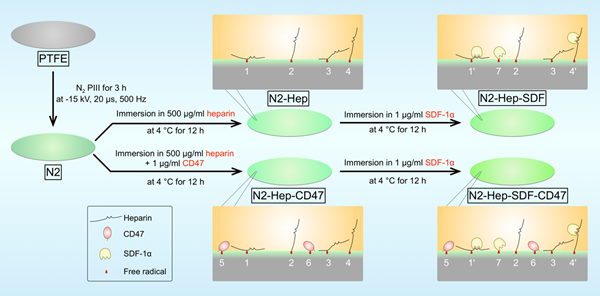 近日,中国科学院深圳先进技术研究院医药所生物医用材料与界面研究中心王怀雨课题组与教授朱剑豪合作,在生物医用高分子材料的表面功能化改性方面取得新进展。研发团队提出了一种“等离子体浸没离子注入+溶液浸泡”的创新表面改性方法,能够简便、高效地将功能性生物分子共价接枝在生物医用高分子材料表面,从而显著改善其表面的生物学性能。相关论文以题为“Linker-free covalent immobilization of heparin, SDF-1α, and CD47 on PTFE surface for antithrombogenicity, endothelialization and anti-inflammation”在线发表在Biomaterials上,论文的第一作者是高昂。