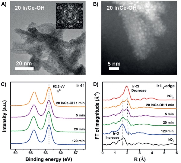 B) 20Ir/Ce-OH纳米结构的HAADF-STEM;