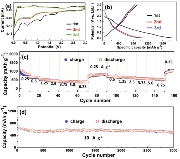 近日,三峡大学倪世兵教授,中科院半导体所李晋闽教授,黄鹏(音译)博士联合在Advanced Functional Materials上发表了题为“Amorphous GaN@Cu Freestanding Electrode forHigh-Performance Li-Ion Batteries”的文章。课题组采用脉冲激光沉淀(PLD法)的方法制备了一种独立式的a-GaN@Cu电极,应用于锂离子电池时,该电极展现了突出的比容量和超长的循环寿命,同时具备高导电性和稳定性。其在0.25A/g和6.25A/g之间进行两次倍率测试,当重新回到0.25A/g时,a-GaN@Cu电极的放电容量达到509mAh/g。这是a-GaN@Cu首次作为锂离子电池负极材料,该成果为拓宽氮化镓在能源储存设备方面的应用提供了方向。