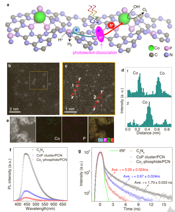 该研究组提出通过设计构建单活性位点结构来分离光生电子和空穴对,并作为助催化剂实现高效的全解水性能 。利用氮化碳纳米空间限域效应合成原子级分散的结构位点,同步辐射X射线吸收谱学以及高角环形暗场像明确形成了单位点Co1-P4构型,从而获得了单位点钴基负载磷掺氮化碳复合型光催化剂。该复合结构在电子能带结构中形成特殊中间态,不仅极大地提高了材料的可见光吸收,而且有效抑制光生电子-空穴对复合,成功将光生载流子寿命显著提高约20倍。他们所设计的光催化剂实现了在模拟太阳光照、不加牺牲剂和贵金属的条件下全解水产氢速率达410.3 μmol h-1 g-1,其中500 nm波长处量子效率达到2.2%。这种单活性位点复合型光催化剂将为进一步提升现有光催化剂的水分解性能提供新的设计思路和方法,同时也为从原子尺度探究催化活性中心和反应机理提供新的有效途径。