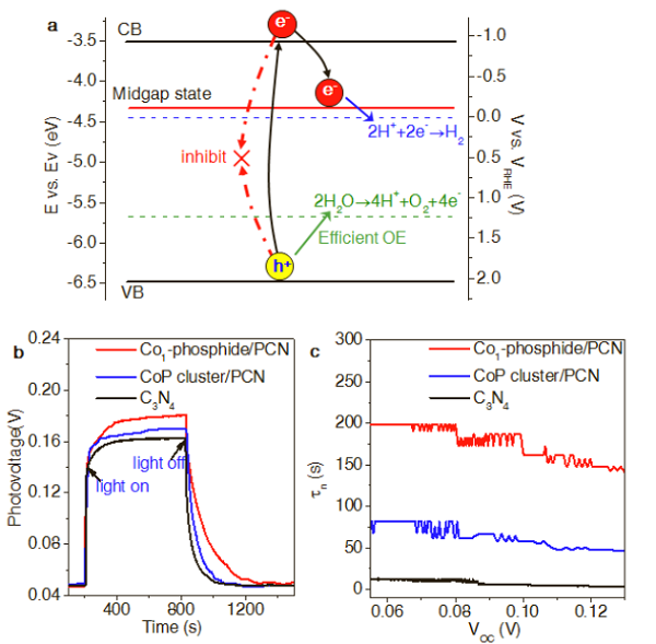 (a)在Co1-磷化物/ PCN光催化剂上太阳能驱动的水分解示意图