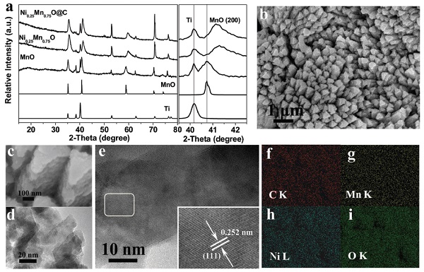 a) MnO, Ni25Mn0.75O和Ni0.25Mn0.75O@C的XRD全谱和部分放大谱;