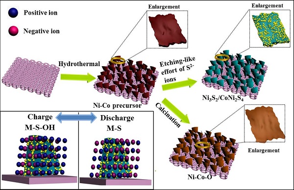 作为超级电容器的重要组成部分,在众多的电极材料中双金属硫化物与相应的单金属硫化物相比拥有丰富的氧化还原反应活性位点;相比于相应的金属氧化物具有更高的导电性和电化学活性。合理的设计纳米结构能够有效的提高材料本身的导电性和利用率,其中2D纳米材料由于各向异性结构和高的表面体积比有效的提高了材料的化学反应界面和缩短了离子传输距离。