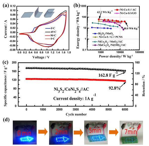 该课题组通过控制对Ni-Co-precursor的硫化条件,巧妙的制备了超薄、多孔纳米片网络自支撑电极。该种结构在KOH电解液中拥有高的稳定性和优良的导电性,构建了快速、高效的电子和离子输运路径。组装的柔性超级电容器拥有杰出的稳定性,机械柔韧性,宽的电压窗口和高的能量密度。为新型高效储能设备的研发提供了一个良好的思路。