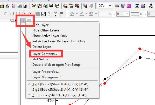 3.新建Y轴图层后在左上角会多出一个图层(数字1和2),在图层数字上单击右键,选择layer content,打开layer content对话框;