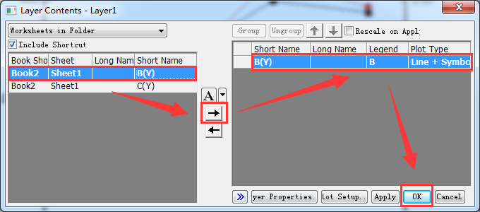 4.把B(Y)设置成图层1的数据,选择OK,同样的操作,把C(Y)设置成图层2的数据,选择OK;