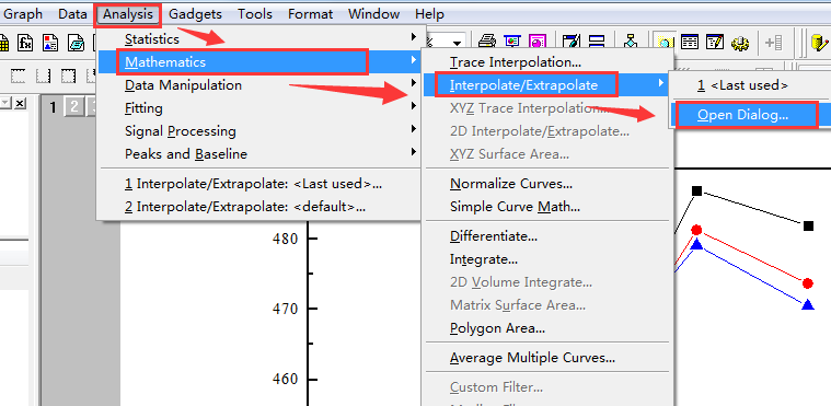 1.选择Analysis—mathematics—Interpolate/Extrapolate,选择Open Dialog