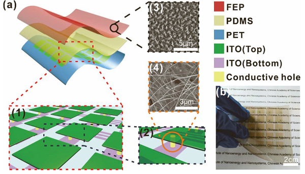 目前,基于不同物理机制的触觉传感器在器件性能上已经取得突破进展。市面上的不少产品利用具有较高压力敏感性的压阻、压电、电容式传感器,能够探测不同大小尺度的压力,但是基于这些材料制成的装置或是依赖于外部电源工作,或是信号太小易受到干扰,难以将外部应力直接转化成足够识别的电信号,因此在使用中存在一定的局限性。而生活中不断增多的可穿戴和便携式电子产品,要求其既能满足复杂的应用,还能适应人们在不同场合的使用,从而对传感器的便利性、舒适性和时尚元素有了更高的需求。