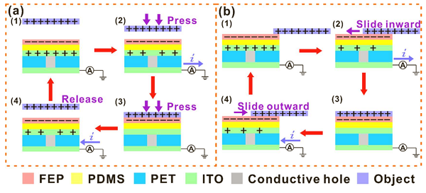 (a,b)像素的工作机制(a)接触分离模式和(b)滑动模式