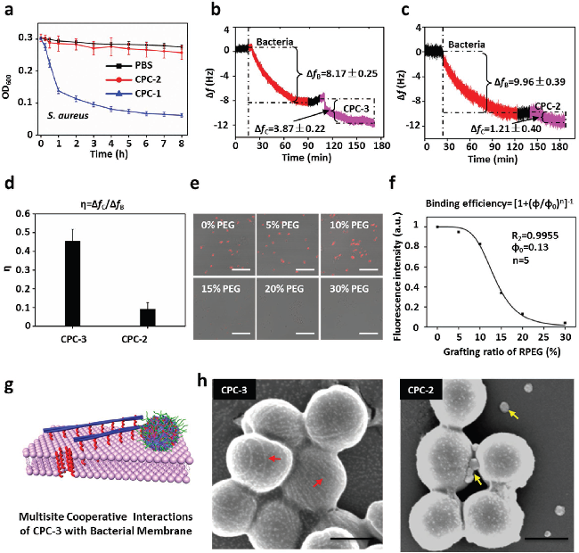 e)具有不同PEG接枝比例的荧光标记的CPC-1和金黄色葡萄球菌在静态培养物中培养1小时的荧光图像。细菌的荧光强度与CPC-1的EPEG接枝率成反比。比例尺,10μm;