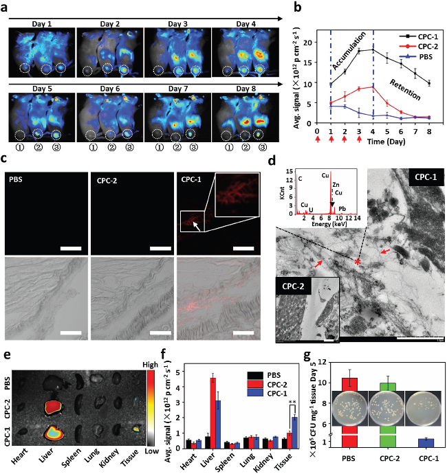 f)尾静脉注射8天后主要器官的平均荧光信号。平均荧光信号值表示为平均值±S.D(N=6)。星号(**)表示**P<0.01的统计学意义;g)在第5天对在感染区域存活的金黄色葡萄球菌进行量化。插入图表示注射有PBS,CPC-1和CPC-2的小鼠感染组织的细菌菌落。误差线由每组5只小鼠确定。