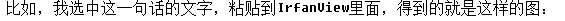 IrfanView其实不是截图工具,它是看图工具。它的强大之处令人惊叹,不仅功能强大,操作还极为效率。截图和它有 什么关系吗?是的,有关系!不知道大家又多少人尝试过复制文字截图的方式?示范一下。比如,我选中这一句话的文字,粘贴到IrfanView里面,得到的就是这样的图: