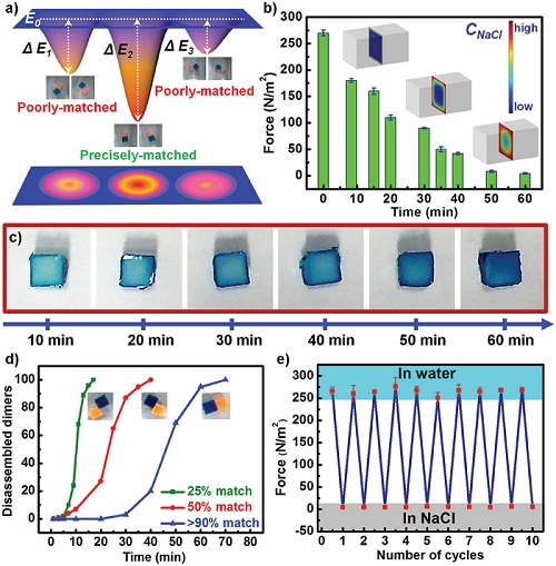 在本文中,研究人员提出了一种基于动态组装系统的自纠错策略,证明了精准、大规模、平行宏观超分子组装(MSA)的可行性,有效解决了MSA过程结构精度低、有序性差的问题。研究人员以带有相反电荷的水凝胶为模型系统,建立了一个纯粹由扩散动力学控制的解组装机制,使得该体系能够自动识别并纠正非精准组装结构:通过将体系反复、交替浸泡于NaCl溶液和纯水中一定时间实现非精准结构的解组装和再组装,历经8次循环、迭代后实现了100个二聚体的100%精准组装。这一自纠错策略解决了MSA中普遍存在的对组装过程中出错不敏感的问题,促进了MSA在材料制备方面的广泛应用。
