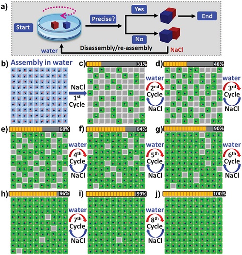 d-j)每个水(5min)/氯化钠(40min)处理循环后,统计NaCl水溶液中保留下来的二聚体数目。进度条表示完美组装的二聚体的百分比:发现通过8次迭代可以实现100个二聚体100%精准组装。