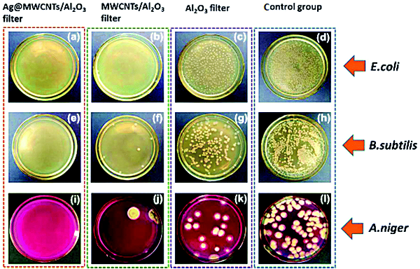 (a-d)大肠杆菌(E. coli), (e-h) 枯草芽孢杆菌(B.subtilis), 黑曲霉菌(A.niger)表征的不同样品的动态抗菌效果对比;(a,e,i)为Ag@MWCNTs/Al2O3, (b,f,j)为MWCNTs/Al2O3, (c,g,k)为Al2O3, (d,h,l)为空白样.