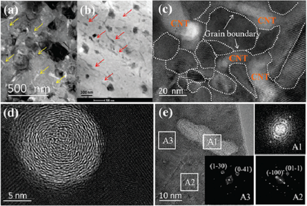 图二 Cu2S晶界内部密集分散的CNTs的形貌结构分析