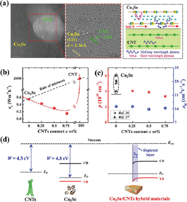 (a) Cu2Se/0.75 wt% CNTs在STEM中收集到的球面像差图像,右侧:Cu2Se/CNTs杂化材料的空穴和声子传导示意图;