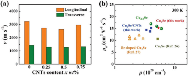 (a) 不同CNTs含量的Cu2Se/x wt% CNTs杂化材料的纵向和横向声速测试;