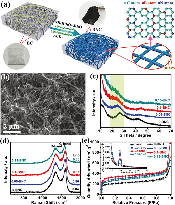 (c-e) 不同B,N掺杂浓度下,BNC样品的XRD图谱(c)、拉曼光谱(d)和氮气等温吸附/脱附曲线(e)。
