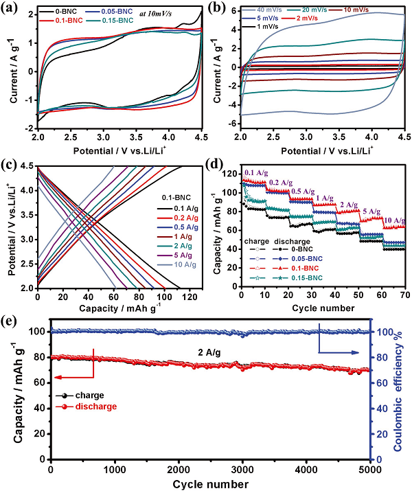 (a) 在扫描速率为10 mV/s下,0-BNC、0.05-BNC、0.1-BNC和0.15-BNC正极的CV曲线;