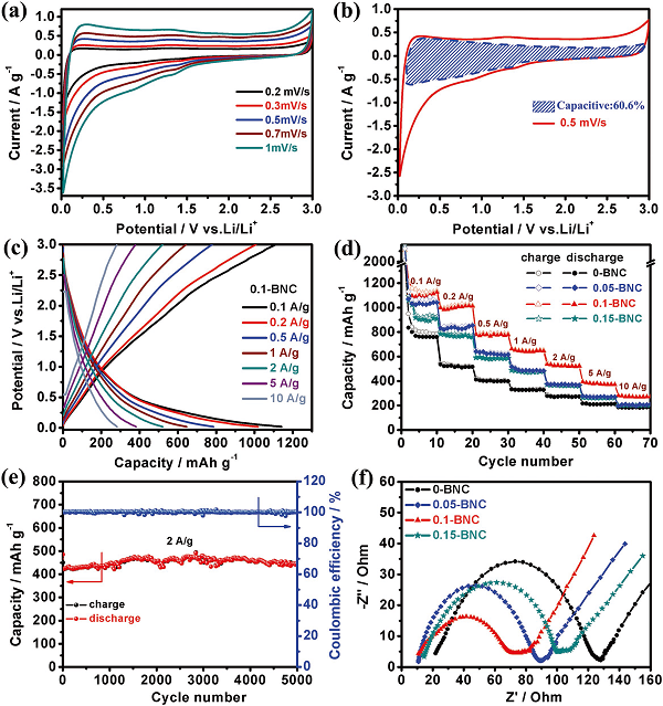 (d) 0-BNC、0.05-BNC、0.1-BNC和0.15-BNC负极的倍率性能图;