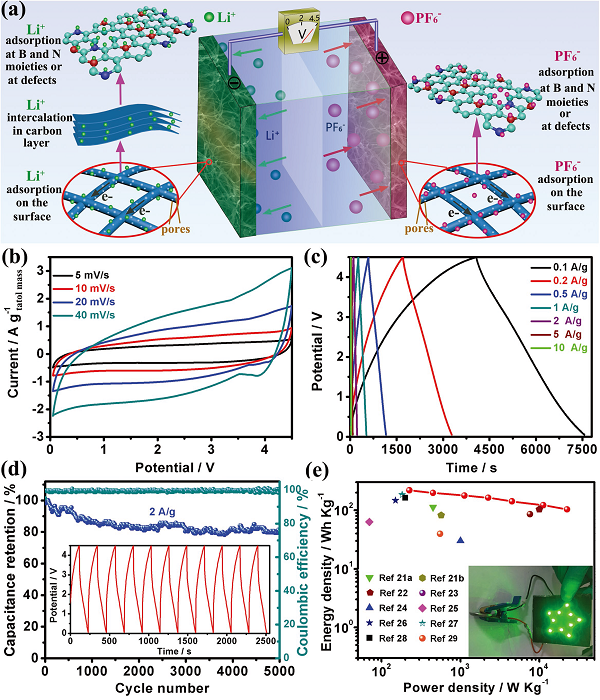 (e) BNC//BNC LIC的Ragone曲线,及与先前报道的LICs的对比,插图为LIC器件为10颗绿色LED面板供能的照片。