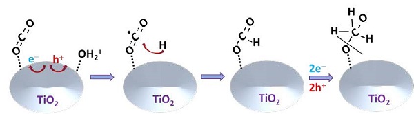 图2.水相中TiO2光催化还原CO2的过程示意图