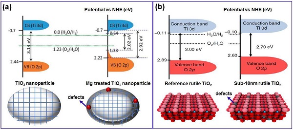 图3.(a)镁处理前后TiO2的能带结构示意图;(b)普通金红石TiO2和10nm以下金红石TiO2的能带结构示意图。