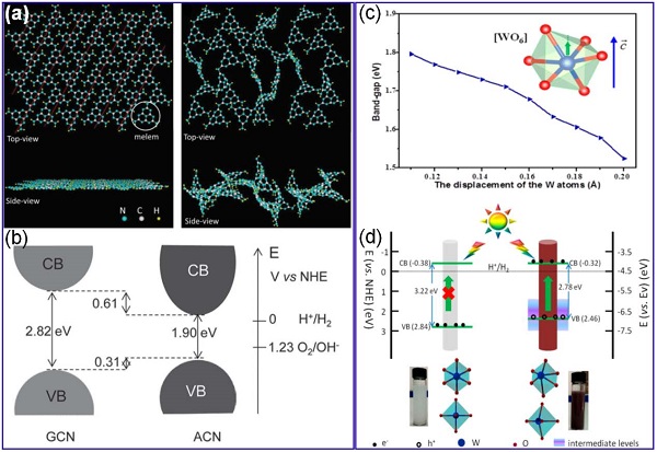 图4. (a) 层状g-C3N4(左)和非晶g-C3N4(右)的结构示意图;(b) 层状g-C3N4和非晶g-C3N4的能带结构示意图。(c) W原子在Ag2WO4中沿着c轴偏离位置与带隙大小的关系;(d) 可见光响应光催化材料的实现及能带结构示意图。