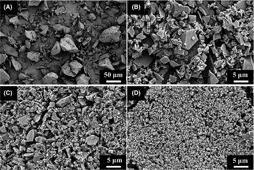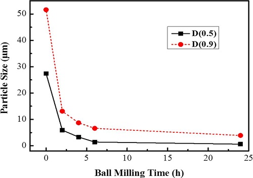 (颗粒尺寸)D0.5和D0.9颗粒的粒径随球磨时间的变化曲线。