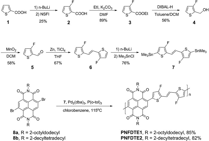 图1 基于氟化二芳基乙烯的共聚物,PNFDTE1和PNFDTE2的合成路线
