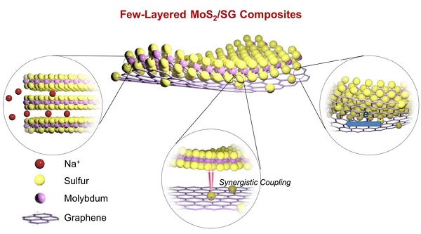 近日,加拿大滑铁卢大学应用纳米材料与清洁能源实验室的陈忠伟教授在先进钠离子电池研究方面取得重要进展并在国际知名期刊 《Advanced Functional Material》上发表了题为 Enhanced Reversible Sodium-ion Intercalation by Synergistic Coupling of Few-layered MoS2 and S-doped Graphene的研究论文。研究人员首次研发出低层数的二硫化钼-硫掺杂石墨烯纳米片二维复合材料(MoS2/SG)的高容量钠离子电池负极。低层数二硫化钼与掺杂在石墨烯上的硫原子之间具有协同耦合作用,使得掺杂硫原子的电子云从SG向MoS2 偏移。该方法通过共价掺杂的硫原子将MoS2和SG这两种二维材料更紧密的结合在一起,从而抑制了二硫化钼在钠离子嵌入脱出时导致的结构破坏并提高了材料的导电性,显著提高了复合材料电极的循环寿命及倍率性能。在1A g-1的电流密度下循环充放电1000圈后复合材料电极的可逆容量保持率仍高达85%。
