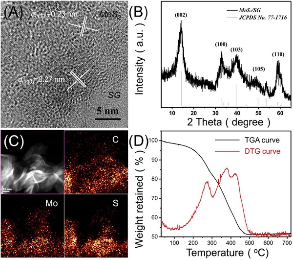 (A)MoS2/SG的SEM图像, ( B, C, D)MoS2/SG 的 TEM 图像