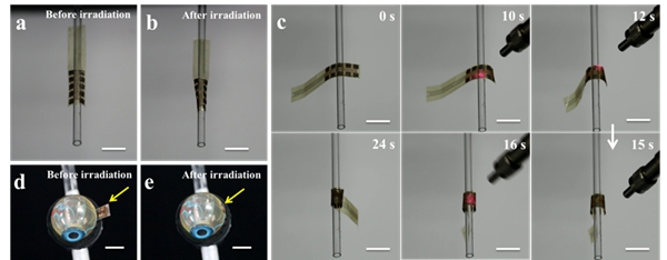 (b, e, h)近红外光照后,功能化电极产生三维扭曲形变。