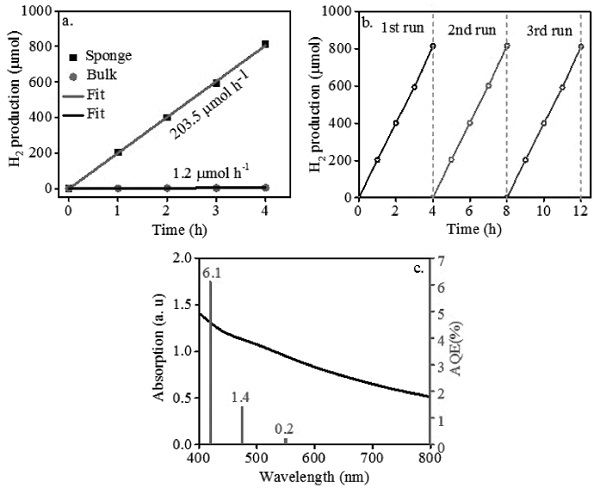 b) 海绵状a-碳化氮在可见光(λ = 420 nm)下循环产氢量